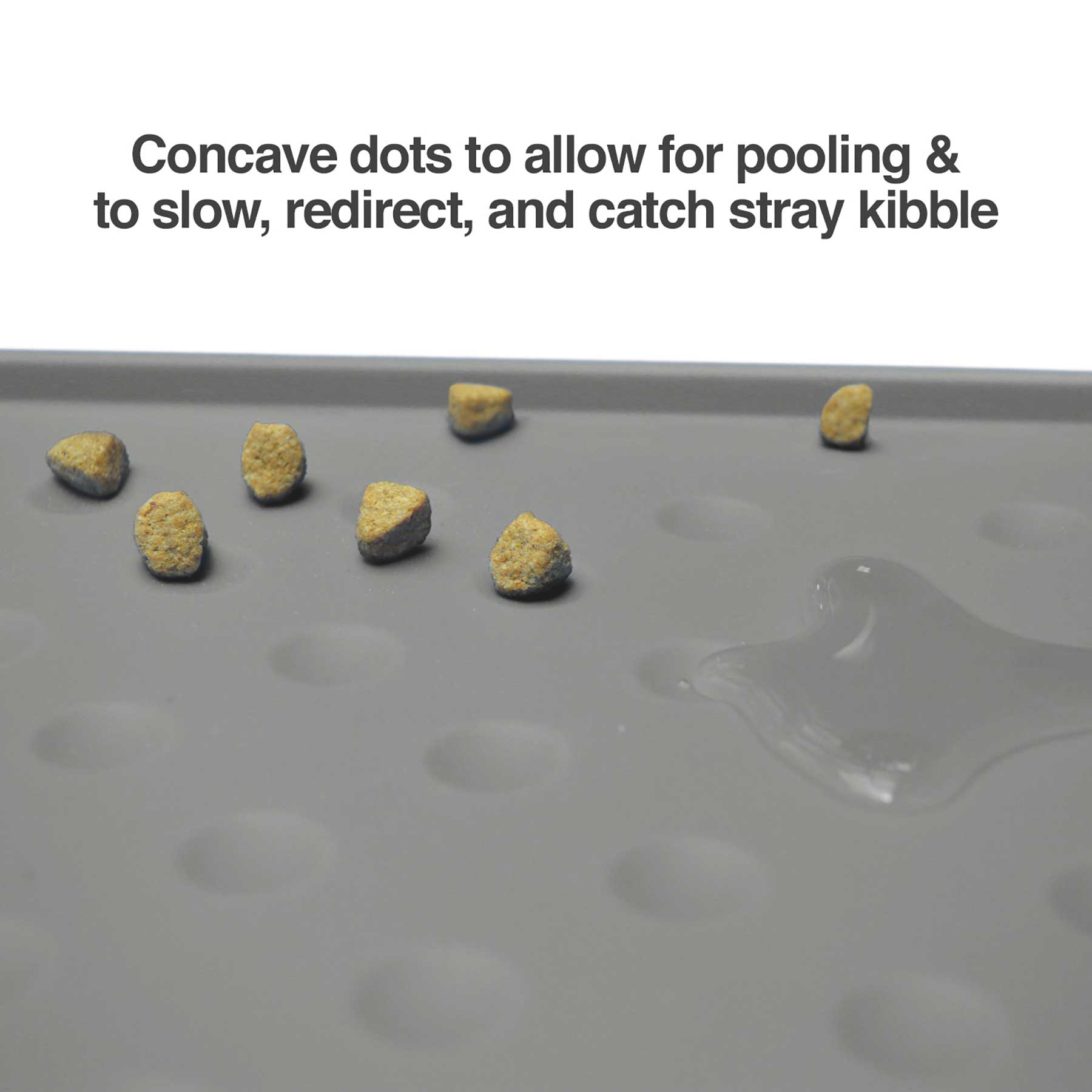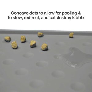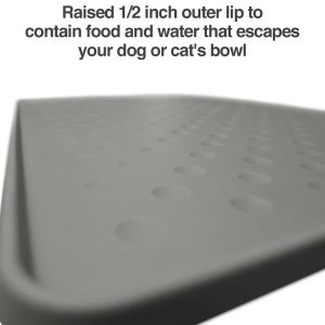 The PetFusion® Tough Grip Dog Food Mat™ is a premium silicone material in a stylish design that blends seamlessly with any home décor. Circular grooves grab, slow, and redirect stray kibble and water spills in order to keep them off your floor. Raised outer lip as an extra barrier. Rigid and durable, easy to fold and carry to garbage or sink, and stays in place. Superior hygiene- anti-microbial, waterproof/stain resistant and non-toxic, non-allergenic. Easy to clean under the sink or with a wet cloth/paper towel. Flexible to bend for cleaning food/ water residue that has dried to the surface. Anti-slip bumps on both the surface and underside of the mat to prevent sliding bowls (happier pet, less Cleaning) or a sliding mat (fewer spills, tidier feeding area).